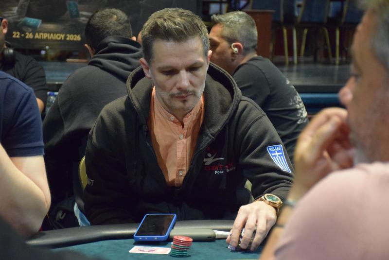 Level 5, blinds 2.000/3.000, ante 3.000 (98 entries + 9 re-entries / 94 players IN) Άλιμος, Περιστέρι, Μαρούσι και Πειραιάς σ' ένα παίκτη! Σπύρος Shehu, εκπροσωπεί τους οφιτεχάδες σ' ένα από τα ακριανά τραπέζια του poker room. - Παλαιότερα