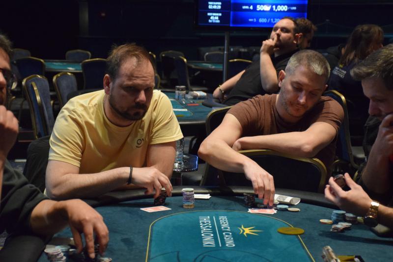 Level 5, blinds 600/1.200, ante 1.200 (112 entries + 18 re-entries / 101 players IN) Έχουν σχηματιστεί ενδιαφέροντα πέταλα σε πολλά τραπέζια, σ' ένα εξ' αυτών δύο από τους πιο έμπειρους παίκτες τουρνουά, ο Μανώλης Ζαχαράκης και ο Γιώργος Ζησιμόπουλος. - Παλαιότερα