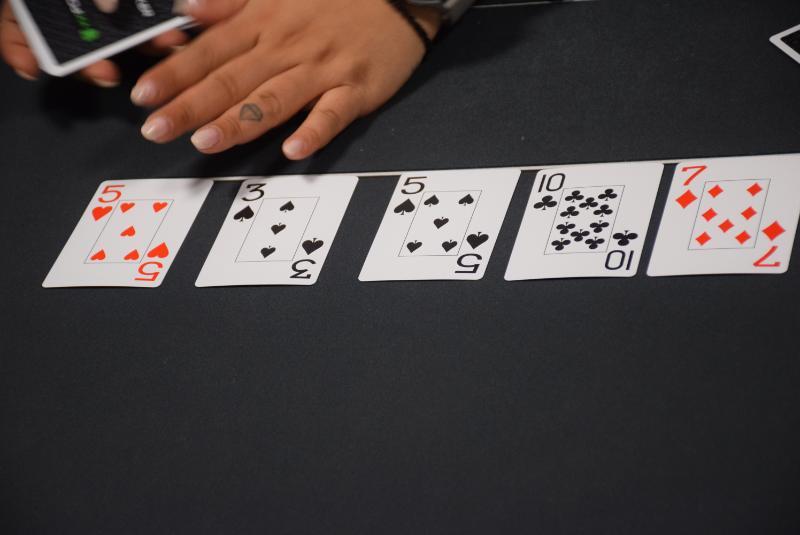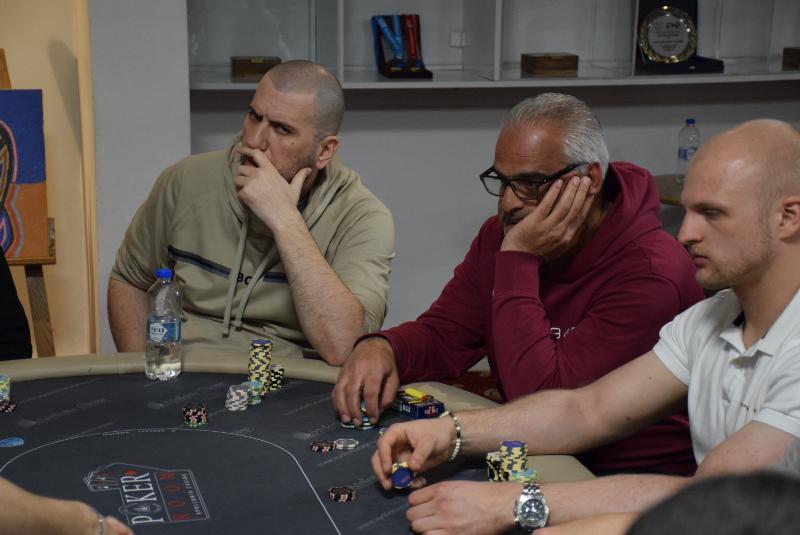 Level 14, blinds 2.500/5.000, ante 5.000 (108 entries + 38 re-entries / 43 players IN) Συλλέκτης (utg) Mini raise Kuch (utg+2) Call Μπαριάμης (bb) Call Flop Mπαριάμης (bb) Check Συλλέκτης (utg) C-bet 20k Kuch (utg+2) Call Μπαριάμης (bb) Call Turn Mπαριάμης (bb) Check Συλλέκτης (utg) Bet 45k Kuch (utg+2) Fold Μπαριάμης (bb) Fold Παρότι το hand δεν πήγε σε showdown αποκαλύφθηκαν τα φύλλα τους, ο Kuch στο fold είπε στον dealer να τα κρατήσει στην άκρη κι έδειξε πως muckαρε βαλέδες! Ένα δεκάρι έσκισε ο Μπαριάμης, ενώ ο νικητής του pot τους έδειξε ντάμες.