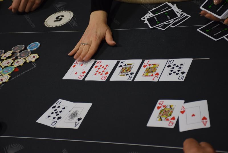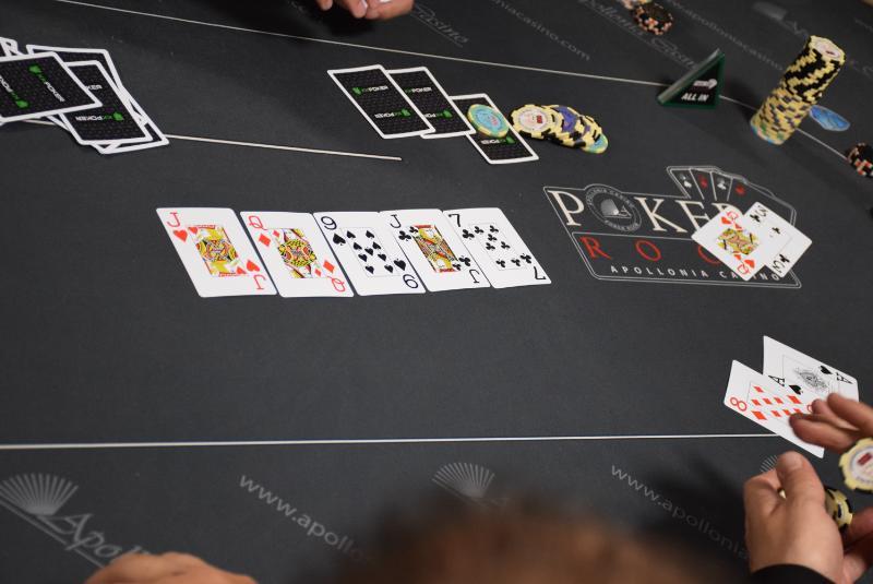 Level 10, blinds 1.000/2.000, ante 2.000 (108 entries + 28 re-entries / 79 players IN) Limp παίκτης από αρχική θέση και ο Καπουρτζούδης, all-in o Krstevski για 25.200 με , call οι δύο limpers με τον πρώτο να λέει 'All-in ότι ανοίξει' έχοντας A-Q. Και ανοίγει 10-J-K! Πάσο ο Καπουρτζούδης, στη φωτο το board.