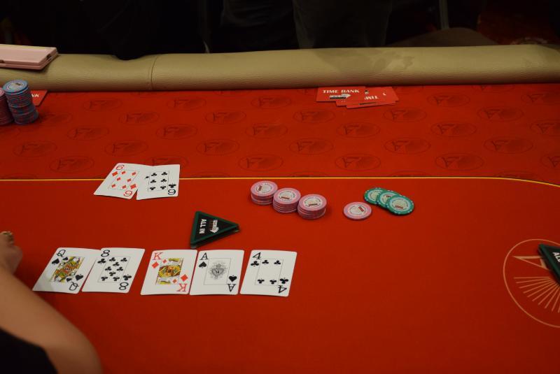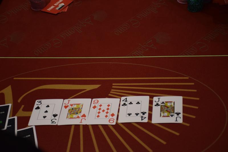 Level 16, blinds 6.000/12.000, ante 12.000 Open-shove από utg+1 (168k) για Κοτζαδάκη με εξάρια, reshove από Τσιχλάκη δύο θέσεις μετά που του είπε ότι έπιασε για πρώτη φορά στο τουρνουά άσους, κράτησαν οι άσοι. 82: - €765 83: - €765 84: - €765 85: Στέλιος Πιτσιβάς - €765 86: Εdgar Yukams - €765 87: Ν.Κ. - €765 88: Γιάννης Κοτζαδάκης - €765 89: Δημήτρης Στάβαρης - €765 90: Vladimir Kirev - €765