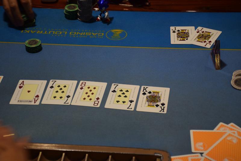 Level 10, blinds 1.000/2.500, ante 2.500 (64 entries / 40 players IN) Διπλασίασε ο Πετύχακης που τον είδαμε να ανακοινώνει all-in (11bbs) σε board με ρηγάδες. Ο αντίπαλος του σκέφτηκε αρκετά λεπτά και τελικά έκανε call με τεσσάρια, το board συμπληρώθηκε με μια ντάμα.