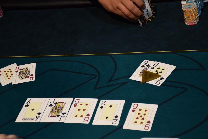 Level 17, blinds 10.000/20.000, ante 20.000 (365 + 103 re-entries / 65 players IN) Mini raise από αρχική θέση ο Μίχας, συμπλήρωσε ο Μολυβας στο bb και στο flop. Check o Μολυβας, c-bet για 55k o Μίχας, raise πετώντας κάπως... επιθετικά τις μάρκες του για 225.000 ο Μολυβας, all-in o Μίχας με άσους, call με ο αντίπαλος του, με και συμπληρώθηκε το board.