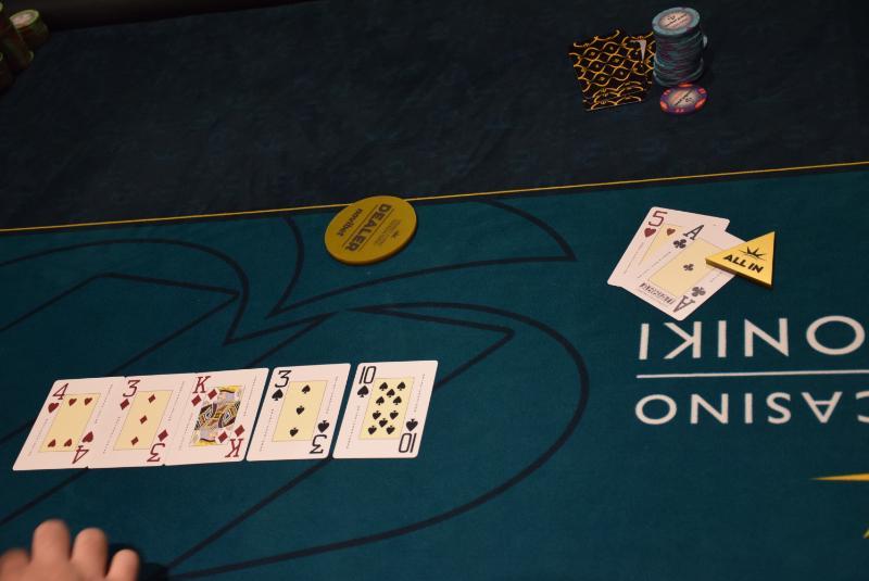 Level 15, blinds 15.000/30.000, ante 30.000 (92 + 41 re-entries / 33 players IN) Στα πέντε τραπέζια μεταξύ άλλων οι 'Niklman', Μίχας, 'Crown', Σταυρόπουλος, Γιαννάκης, Λάππας, Δάλλας, Μανέκας, Π.Παπαδόπουλος, Κ.Γενναίος, Θάνος, Ζησιμόπουλος, Νταμάρης, Διαμαντόπουλος, Γ.Ελευθεριάδης, Τσακνής, Κιουτσούκης, Δημητρός, Δημάδης, Πετυχάκης και 'POLY10'.