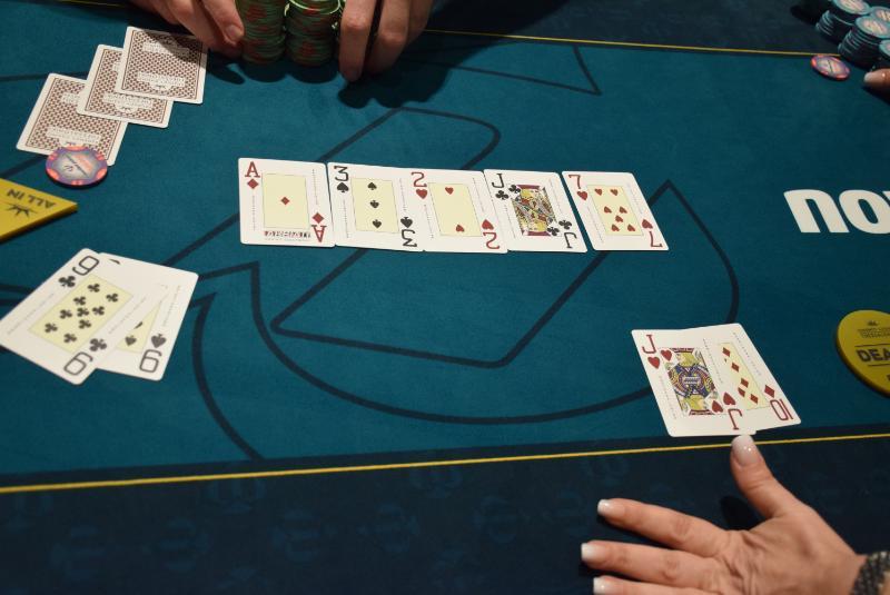 Level 21, blinds 75.000/125.000, ante 125.000 Σε flop 10-9-4 rainbow ανακοίνωσε το all-in με βαλέδες ο Ελευθεριάδης, πήρε call από τον Ρυμενίδη που ήταν short κρατώντας , στη φωτο το board. 12: Γιώργος Ρυμενίδης - €657