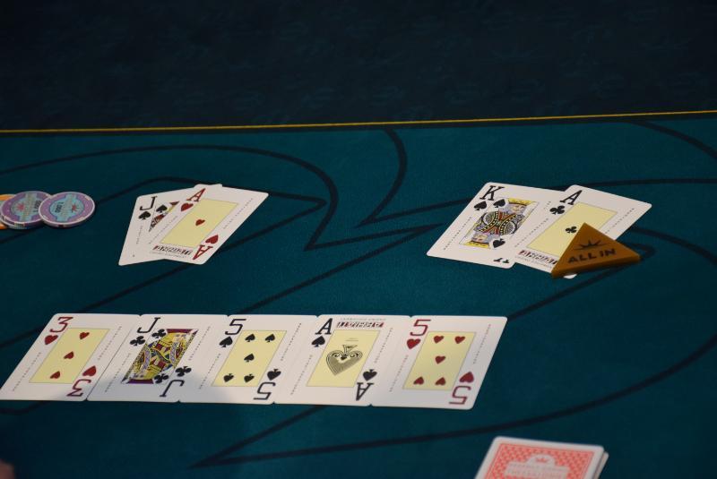 Level 13, blinds 4.000/8.000, ante 8.000 (119 entries + 60 re-entries / 47 players IN) Κάνοντας τις γύρες μας πέσαμε στο all-in (242k) του Βουλδή σε board . Ο Στρούλης που είχε τοποθετήσει 60k στο co σκεφτόταν αρκετή ώρα, ζητήθηκε time και 1-2 δευτερόλεπτα πριν εκπνεύσει ο χρόνος muckαρε τα φύλλα του. Έναν άσο έδειξε ο Βουλδής, με τον αντίπαλο του να λέει πως δεν είχε άσο. -