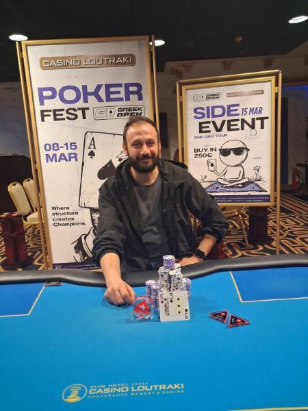 Τελικό τραπέζι και στο side event, €5.830 η πρωτιά! Το €250 side event είναι ουσιαστικά το αποχαιρετιστήριο event του Loutraki Greek Open και αυτό που θα χαρίσει το πέμπτο τρόπαιο του φεστιβάλ! Γνωστά ονόματα της ελληνικής κοινότητας βρίσκονται στο 9-handed final table και τους πλαισιώνουν οι Rudolf Fuong και Mark McKenzie. Όλοι τους έχουν εξασφαλίσει από €529 και στοχεύουν στα €5.830 της κορυφής! Τα stacks του final table Θέση 1: Rudolf Fuong - 385.000 Θέση 2: Θεοφάνης Ποζιόπουλος - 708.000 Θέση 3: White Ivey - 306.000 Θέση 4: Νίκος Μπελιβάνης - 368.000 Θέση 5: Γιώργος Παπακωνσταντίνου - 624.000 Θέση 6: Δημήτρης Μπαρμπαθανάσης - 1.610.000 Θέση 7: Αλέξανδρος Βλαχάκης - 480.000 Θέση 8: Mark McKenzie - 232.000 Θέση 9: Κώστας Τζίνης - 455.000 Tα έπαθλα 1: €5.830 2: €3.935 3: €2.743 4: €1.740 5: €1.286 6: €983 7: €775 8: €624 9: €529 10: €475